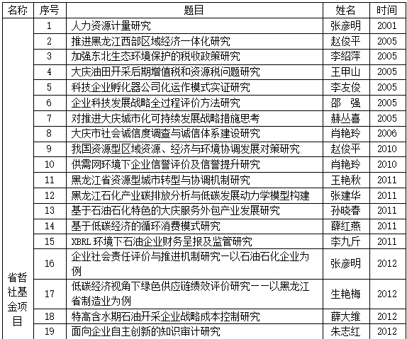 黑龙江省哲学社会科学研究规划项目46项,省自然基金项目5项。省教育厅人文社科项目60项,省科技厅项目2项,中石油软科学研究项目2项,人社厅-省博士后基金项目3项,省高校人文社会科学重点研究基地项目11项。